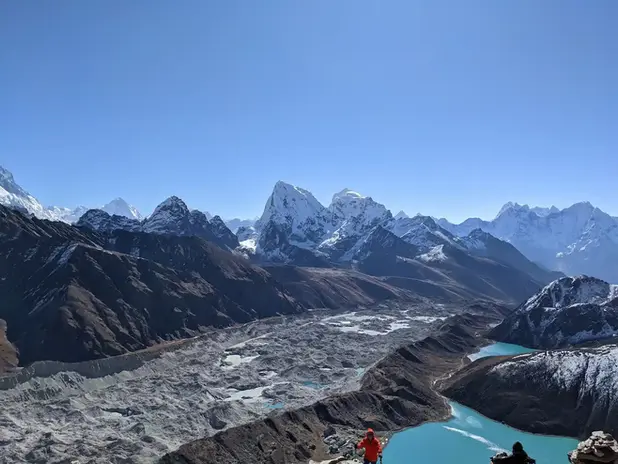 Una variante espectacular que añade color a la alta montaña. Caminarás junto a los lagos turquesas sagrados de Gokyo, subirás al mirador Gokyo Ri y cruzarás el desafiante paso Cho La para conectar con la ruta clásica al Campo Base.